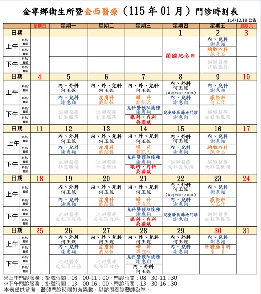 115年1月金寧鄉衛生所暨金西醫療門診時刻表